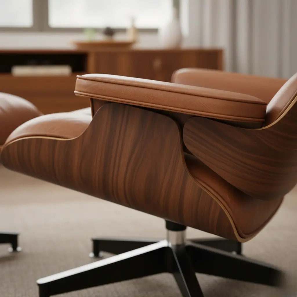 • Matériaux nobles exigés : Pour la Lounge Chair, la qualité se joue sur deux détails : un cuir aniline pleine fleur qui patine avec le temps (pas de similicuir) et une coque en contreplaqué 8 plis.