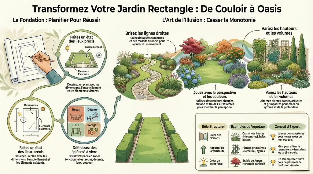 Pourtant, cette forme, si commune, n’est pas une fatalité. Loin de là. C’est une toile blanche qui attend juste les bonnes astuces pour se transformer. Le secret n’est pas de dépenser des fortunes, mais d’être un peu malin. Pensez à votre jardin non pas comme une seule entité, mais comme une succession de petites « pièces » à découvrir.